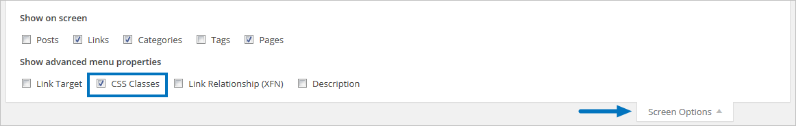 - Click Screen Options in the upper right corner of the Menus page to show more options for your menu items.